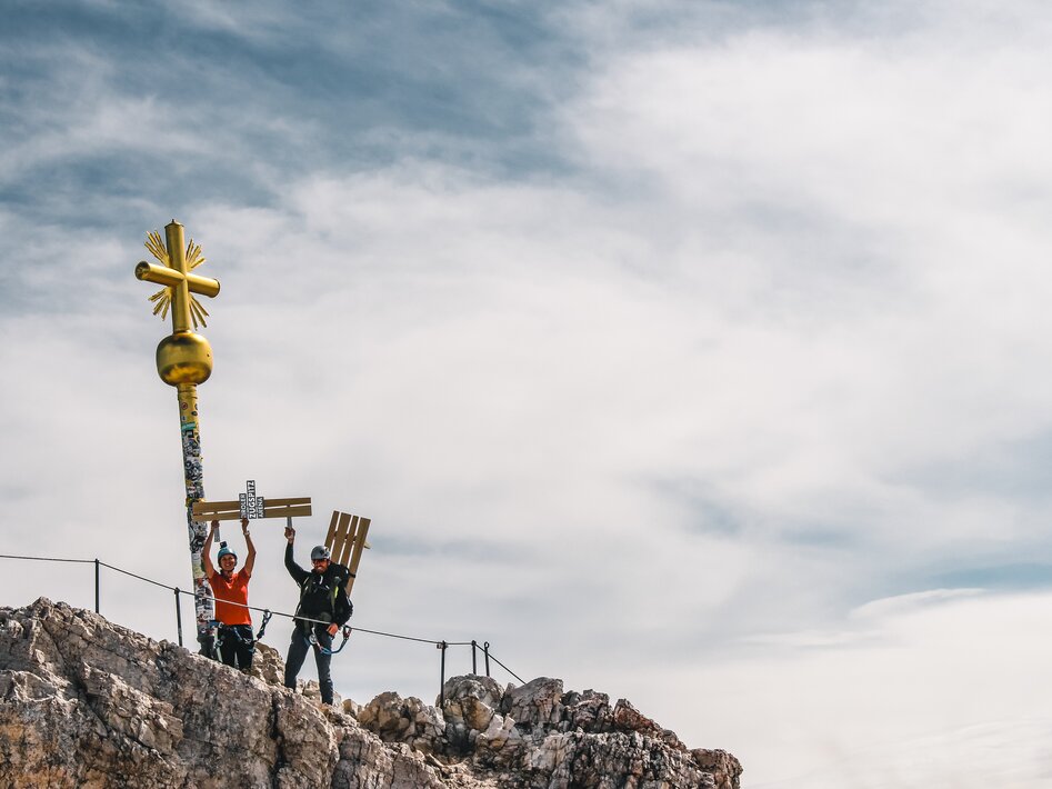 Keine Sorge: Die Zugspitze kann man auch ohne Holzbankerl auf dem Rücken besteigen! Kürzer, direkter und mindestens so erlebnisreich wie von der bayerischen Seite führen zwei Routen von der Tiroler Zugspitz Arena auf den Fastdreitausender: Die Bergtour von Ehrwald über das „Gatterl“ und die Knorrhütte bietet einen sechs- bis achtstündigen Aufstieg ohne Kletterpassagen. Wer etwas ambitionierter ist und bereits ausreichende Klettererfahrung hat, wählt die fünfstündige Tour über die Wiener Neustädter Hütte und den Klettersteig „Stopselzieher“. Beide Routen sind auch als Zweitagestour mit Hüttenübernachtung möglich.