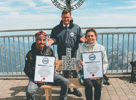 „Schwerstes auf einen Berg getragenes und dort aufgebautes Möbelstück.“ Damit dieser Weltrekord vom Rekord-Institut für Deutschland gelistet wurde, nahm die Tiroler Zugspitz Arena einiges auf sich. Besser gesagt: Ein Ehrwalder Bergführer (Riccardo Mizio / @riccardomizio) und eine Instagrammerin (Sarah Wingendorf / @sarah_wing) trugen gemeinsam eine Bank auf die Zugspitze. Das bedeutete: Zwei Tage lang lastete ein Gewicht von mindestens 10 Kilogramm auf den Schultern der beiden Träger. Gut 2.000 Höhenmeter musste das Holzbankerl von Ehrwald über das sogenannte „Gatterl“ auf den 2.962 Meter hohen Gipfel geschleppt werden. Der Weltrekordversuch fand am 27./28. August statt. Übernachtet wurde auf der Knorrhütte. Nach zwei anstrengenden, aber unvergesslichen Tagen war es auch endlich geschafft. Riccardo und Sarah dürfen sich somit Inhaber einer Weltrekordurkunde nennen.