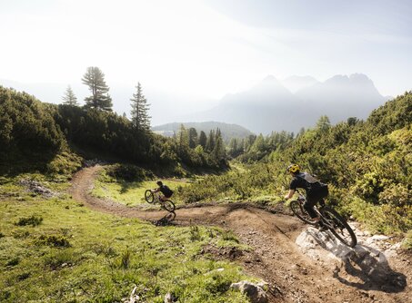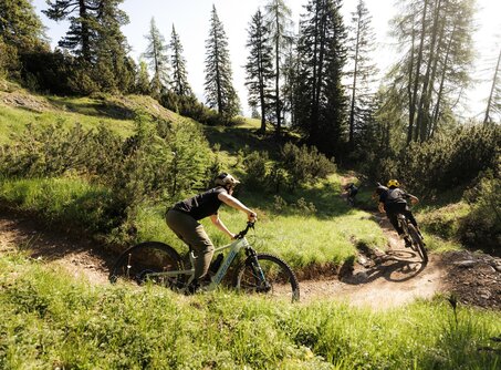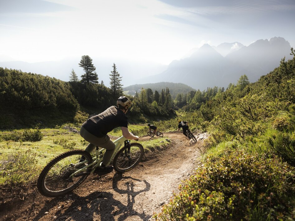 Abfahrt über Forstweg bis Einstieg Grubigalmtrail (864). Sehr anspruchsvoller Singletrail, der Enduroherzen höher schlagen lässt. Der Trail startet ziemlich offen mit einigen Kurven über teils sehr losen Untergrund. Zunehmend schmaler werdend, wird der Untergrund fester jedoch auch verblockter und mit Wurzeln versetzt.