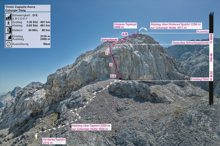 From the Coburger Hütte via the Ehrwalder Almbahn mountain station, approx. 2.5 hrs.